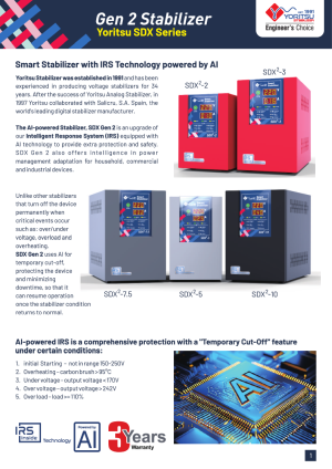 The AI-powered Stabilizer, SDX Gen 2 adalah upgrade dari Intelligent Response System (IRS) kami yang dilengkapi dengan AI teknologi untuk memberikan extra proteksi dan safety. SDX Gen 2 juga menawarkan kecerdasan dalam adaptasi management daya untuk perangkat rumah tangga, komersial dan industri